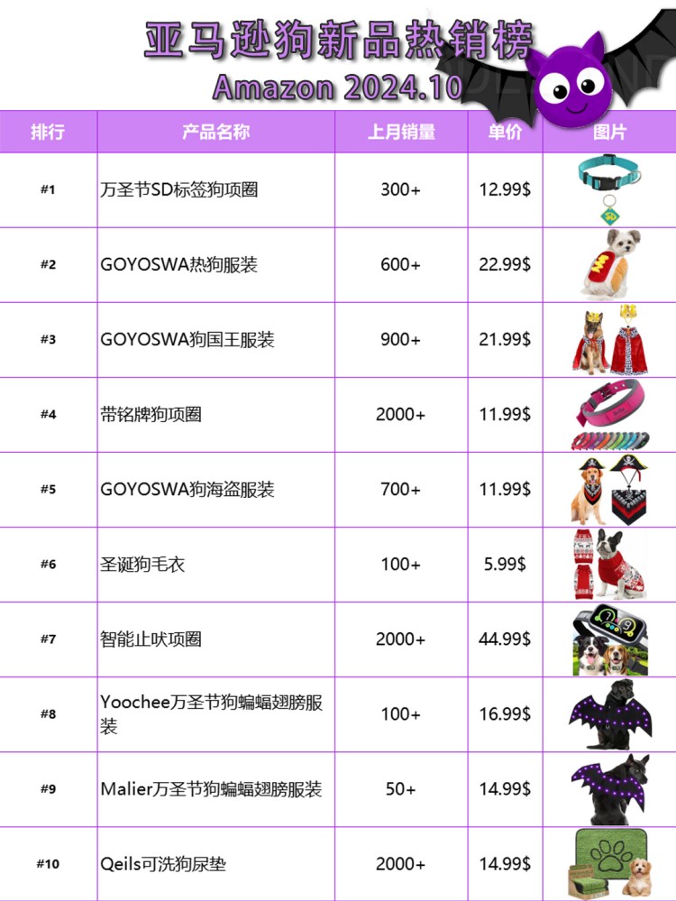 万圣节要来了,亚马逊狗狗新品Top10,万圣节主题的产品大量上榜!#1 万圣节SD标签狗项圈上月销量:300+单价:12.99$#2 GOYOSWA热狗服装上月销量:600+单价:22.99$#3 GOYOS···
